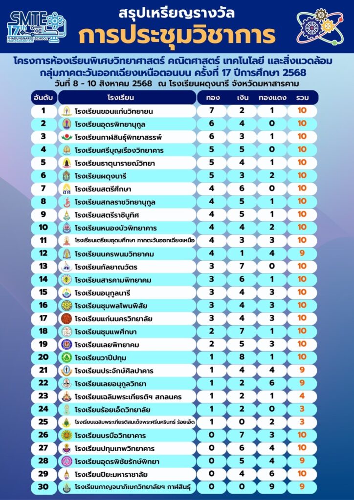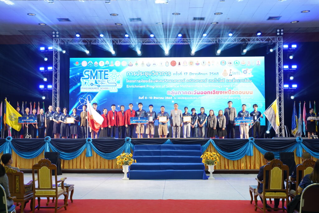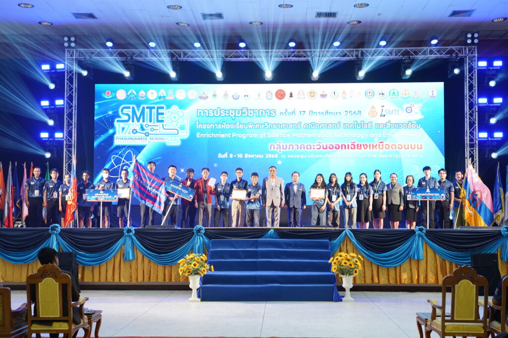 เมื่อวันที่ 9 และ 10 สิงหาคม 2568 ดร.คมสันต์ ชุมอภัย ผู้อำนวยการโรงเรียนแก่นนครวิทยาลัย ประธานเครือข่ายโครงการห้องเรียนพิเศษวิทยาศาสตร์คณิตศาสตร์เทคโนโลยีและสิ่งแวดล้อม(SMTE) มัธยมศึกษาตอนปลาย เครือข่ายภาคตะวันออกเฉียงเหนือตอนบน เป็นเกียรติในพิธีเปิดการประชุมวิชาการวิทยาศาสตร์และเทคโนโลยีครั้งที่ 17 โรงเรียนผดุงนารี จังหวัดมหาสารคาม เจ้าภาพการจัดงาน พิธีเปิดและพิธีปิด ณ มหาวิทยาลัยราชภัฏมหาสารคาม ในการนี้ได้ให้เกียรติ มอบเกียรติบัตรรางวัลกับนักเรียนที่ได้รับผลการแข่งขันการนำเสนอโครงงานและได้รับธงเจ้าภาพการประชุมวิชาการครั้งที่ 18 โดยโรงเรียนแก่นนครวิทยาลัย เป็นเจ้าภาพในปีการศึกษา 2569 ทั้งนี้ มีคณะผู้บริหาร หัวหน้ากลุ่มสาระการเรียนรู้วิทยาศาสตร์และเทคโนโลยี คณะครูและนักเรียน ร่วมรับธงเจ้าภาพในครั้งนี้ด้วย